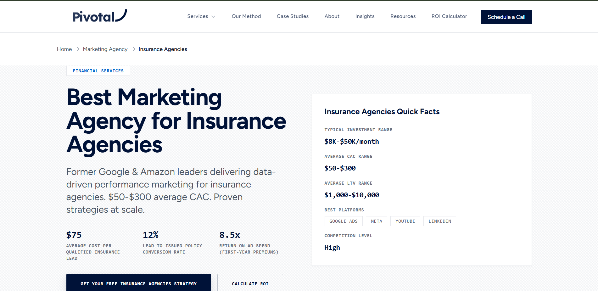 Pivotal Consulting Group delivers performance marketing strategies specifically for insurance agencies, balancing channels like Google Ads, Meta, LinkedIn, and video to optimize conversion costs and ROI.